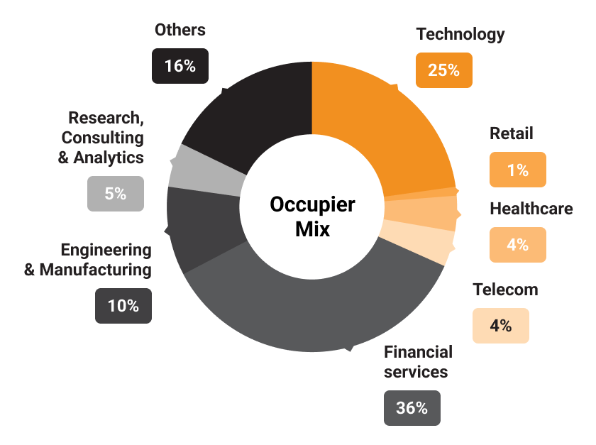 The park has a completed area of 11.8 msf and offers an integrated “business ecosystem” to its occupiers. It houses 68 tenants with more than 100,000 park users.